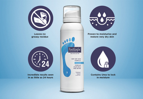 Footlogix Cracked Heel Formula is a lightweight moisturizing mousse specifically designed for dry, rough, and cracked heels. The fast-absorbing foam uses Dermal Infusion Technology® to deliver moisture deep into the skin while leaving no greasy residue.